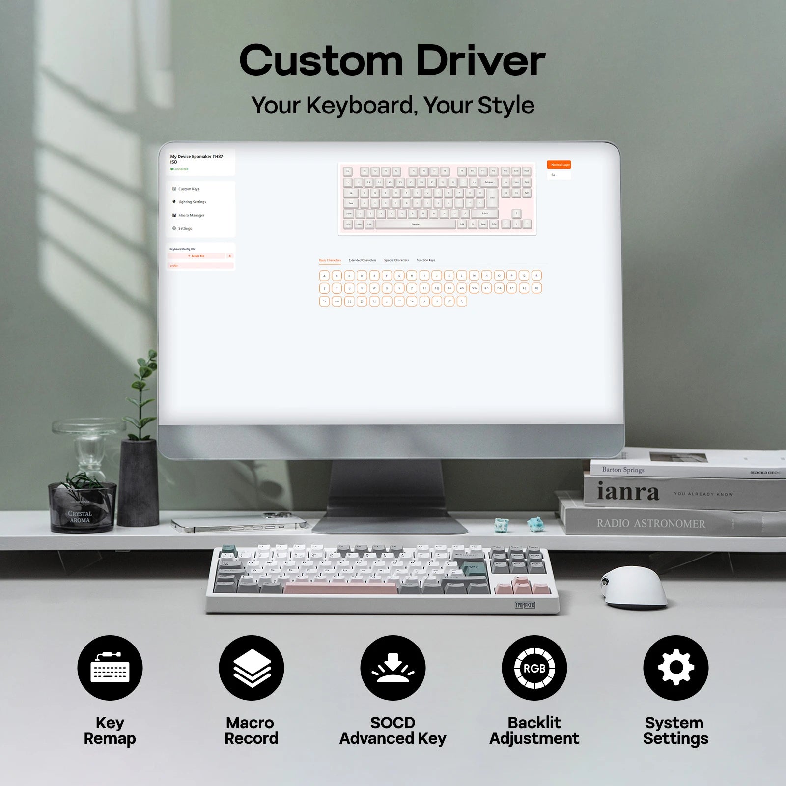 Embrace total control with the TH87 ISO-UK custom keyboard, ideal for gamers who demand performance and flexibility. The pre-lubed, smooth switches offer a fantastic, consistent typing with no modification required, while the hot-swappable PCB streamline the switch-swap experience for easy customization. Assign a complex key sequence to a single macro key, or remap rarely used keys to essential shortcuts, with Chrome-based software accessible online and offline on Mac/WIN, the TH87 ISO-UK custom keyboard is a perfectly tailored extension of your workflow, for a decisive edge in any task.
